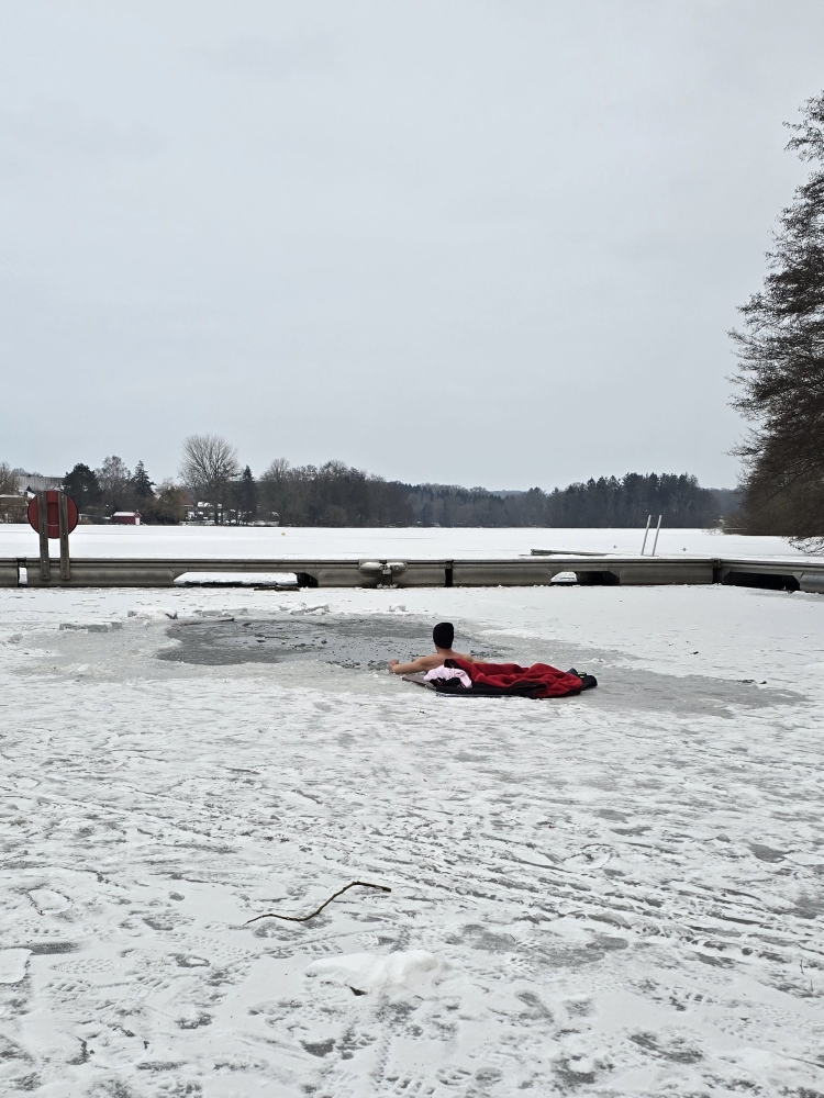 Unter anderem ausgestattet mit einem Beil und einer Badehose war Normen aus Barbüttel heute zu Gast im Freibad. Sorgsam bereitete er seine Badestelle vor, stieg hinein in das eiskalte Wasser und genoss konzentriert die Kälte. Nach einigen Minuten stand er glücklich auf dem Eis und sagte: „Man muss auf seinen Körper hören“ und „es ist immer ein Risiko, gerade für Ungeübte“.