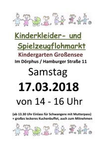 Am Samstag, den 17. März 2018 findet wieder der Kinderkleider- und Spielzeugmarkt des Kindergarten Großensee e.V. von 14-16 Uhr im Dörphus, Hamburger Str. 11 in Großensee (neben der Feuerwehr) statt.